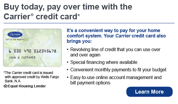 Buy today and pay over time with the Carrier® credit card, which is issued with approved credit by Wells Fargo Bank, N.A. an Equal Housing Lender.